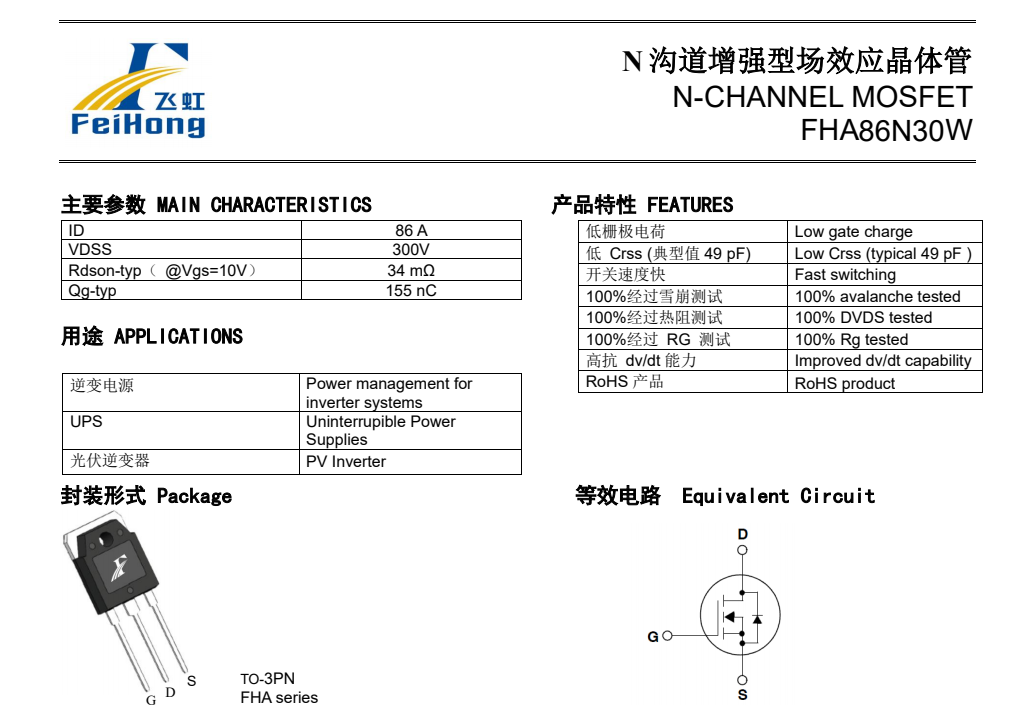 綜合以上的產品參數,全橋逆變電路MOS管,代換IXFH86N30T3000W戶外儲能電源逆變模塊的全橋逆變電路除選用IXFH86N30T場效應管外,還可以用飛虹半導體的國產型號:FHA86N30W型號參數來代換。